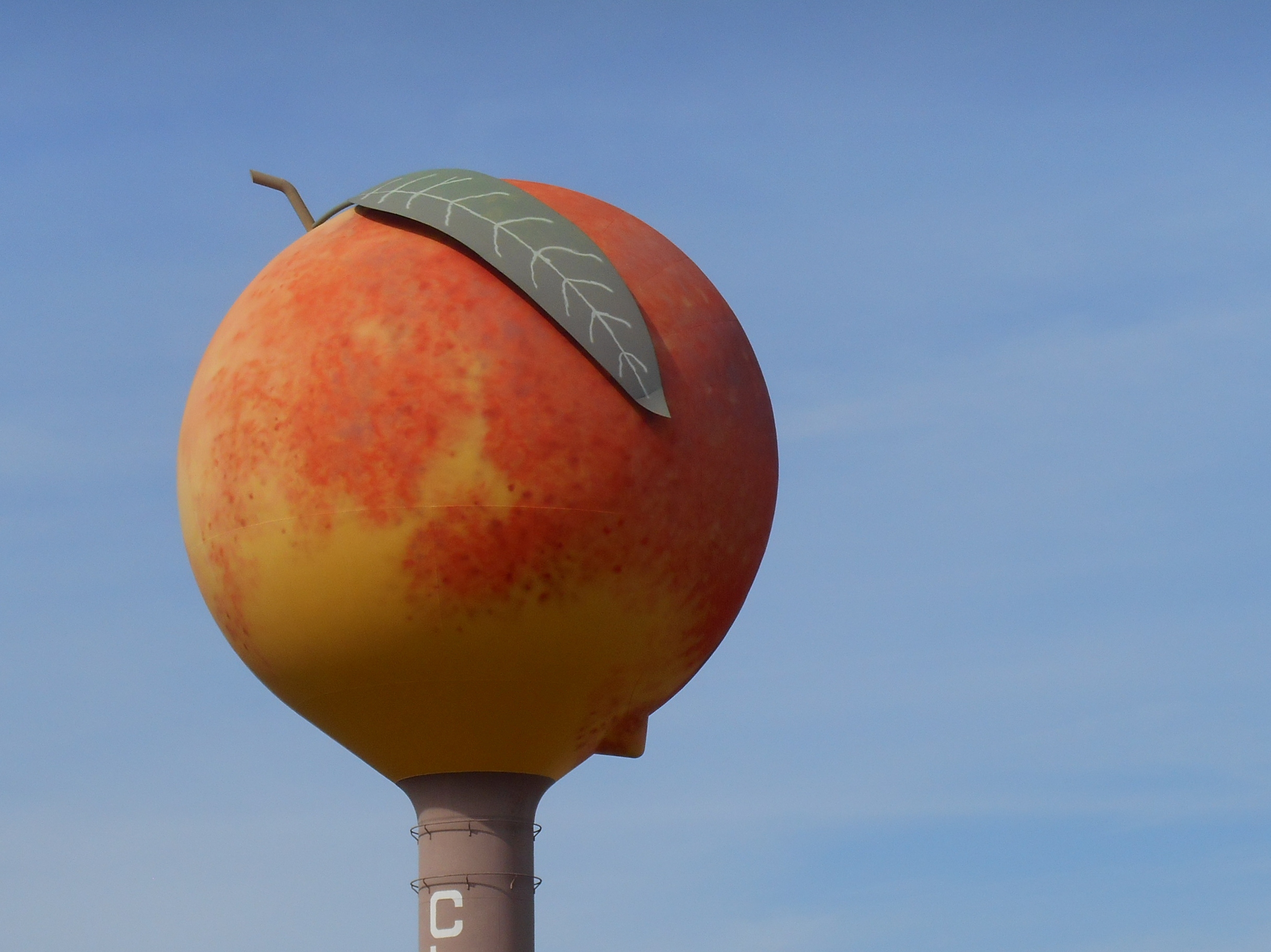 The day provided only two good diversions. First at the Peach Tower where I stopped for an in-coach sandwich lunch. Peach and fruit stands were situated on the side roads, but alas it’s the wrong season and all were closed for winter.