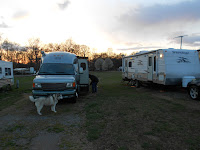 The school has a large campus of buildings nestled in the woods and along back country roads. Tonight we are tucked into their teeny tiny campground – only a dozen or so sites placed haphazardly and at such odd angles that it took 20 minutes of maneuvering to stuff the coach into a spot. Good thing we’ve got a little camper!